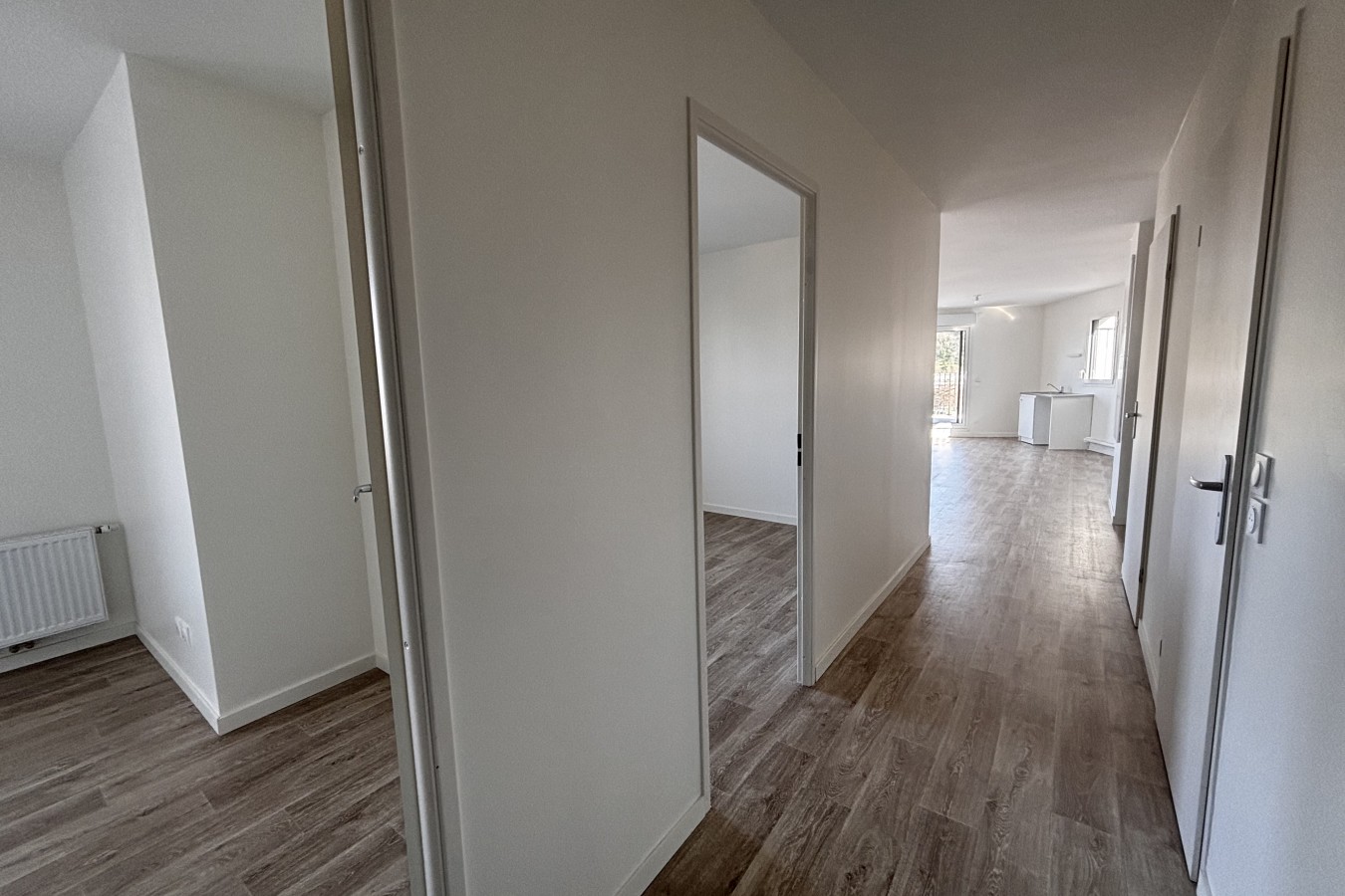 Un couloir dessert quatre chambres, dont une avec salle d’eau privative, ainsi qu’une salle de bain indépendante et des WC séparés, garantissant confort et fonctionnalité pour toute la famille.