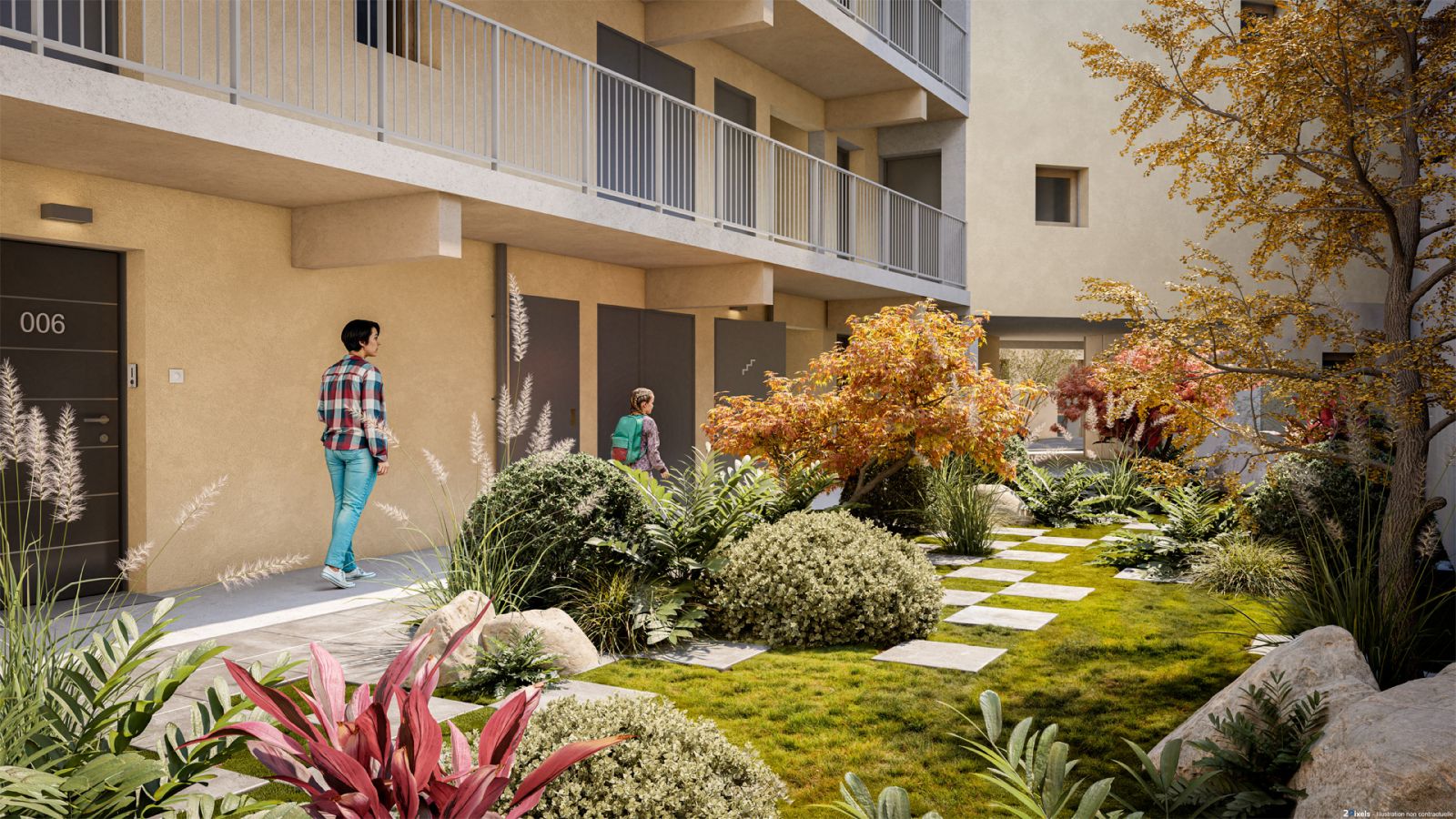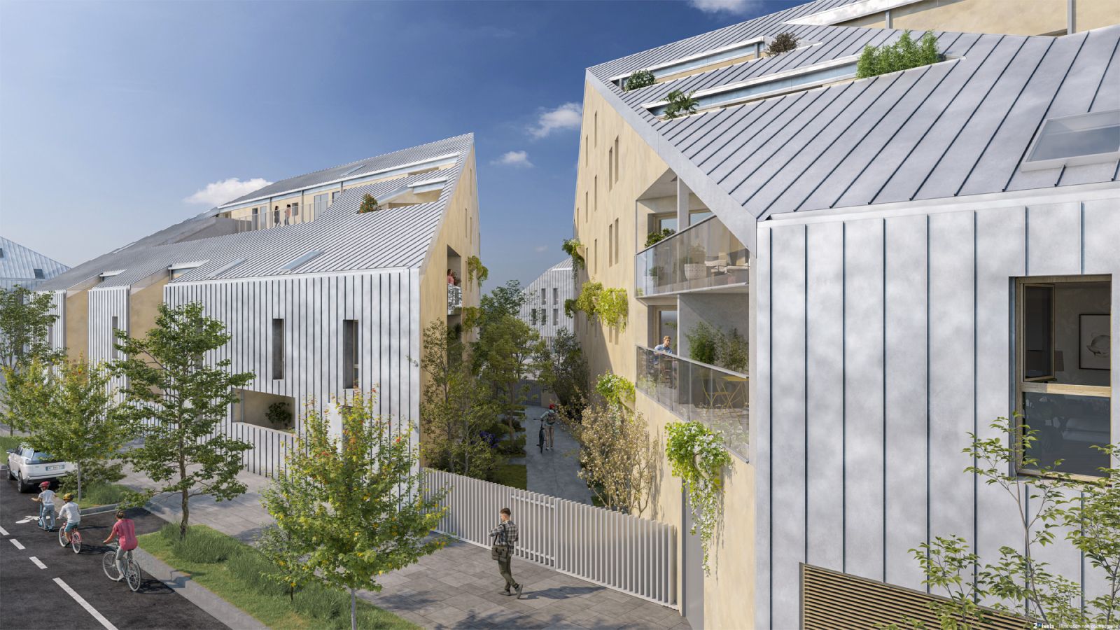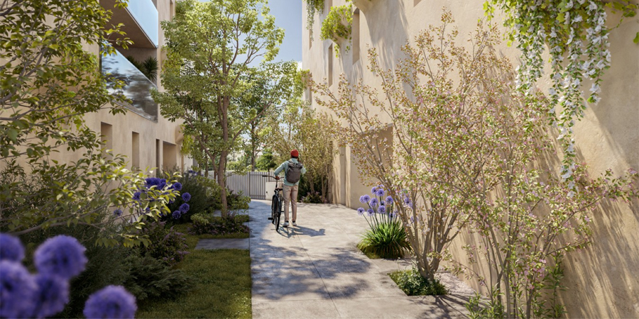 L'un des atouts majeurs de la résidence Patio réside dans son rapport privilégié à la nature. Loin de l'agitation urbaine, un chemin privatif, planté de pommiers et de poiriers horticoles et bordé de jardinières de vigne, mène à l'entrée des bâtiments. C'est une véritable invitation à la sérénité. Au centre de chaque bâtiment, à l'abri des regards, se dévoilent des jardins intérieurs paysagers. Inspirés des patios zen, ces espaces végétalisés créent une atmosphère apaisante, où les habitants peuvent se ressourcer et flâner. Les fenêtres des appartements donnent directement sur ces oasis de verdure, permettant aux résidents de profiter en permanence du calme et de la beauté de ces espaces privés.